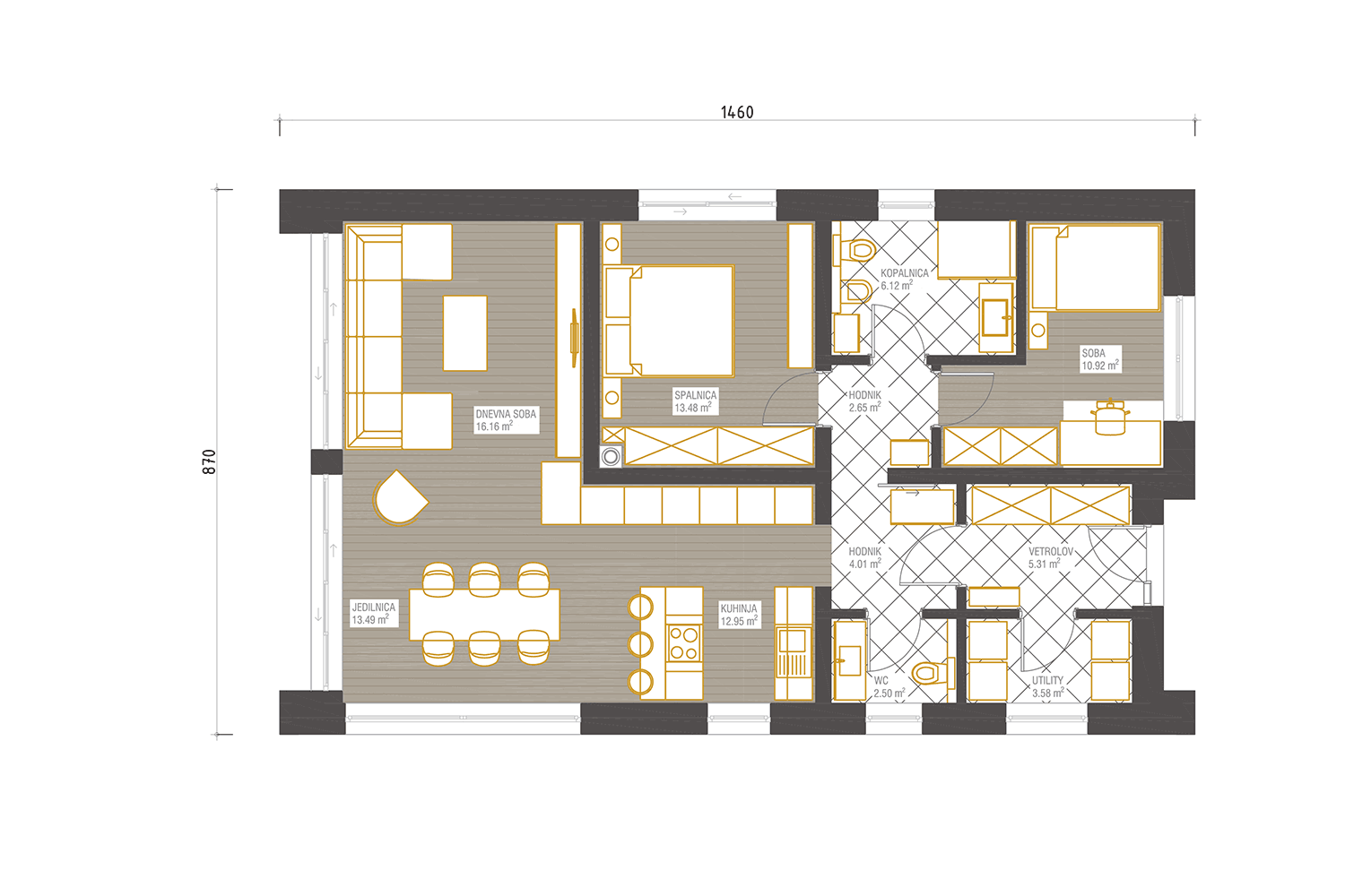 - notranjost je surova, brez estriha, ometov ter strojnih in elektro inštalacij