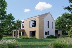 Hiša Flora z zanimivo obliko privlači marsikateri pogled in v kombinaciji lesa izraža modernost in trajnostnost vgrajenih materialov. Pritljičje je v celoti namenjeno bivalnim prostorom, prostorna kuhinja z otokom pa se lepo povezuje v jedilnico, ki je lahko tudi glavni prostor za druženje. Zunanja terasa je povezana z notranjim dnevnim prostorom.