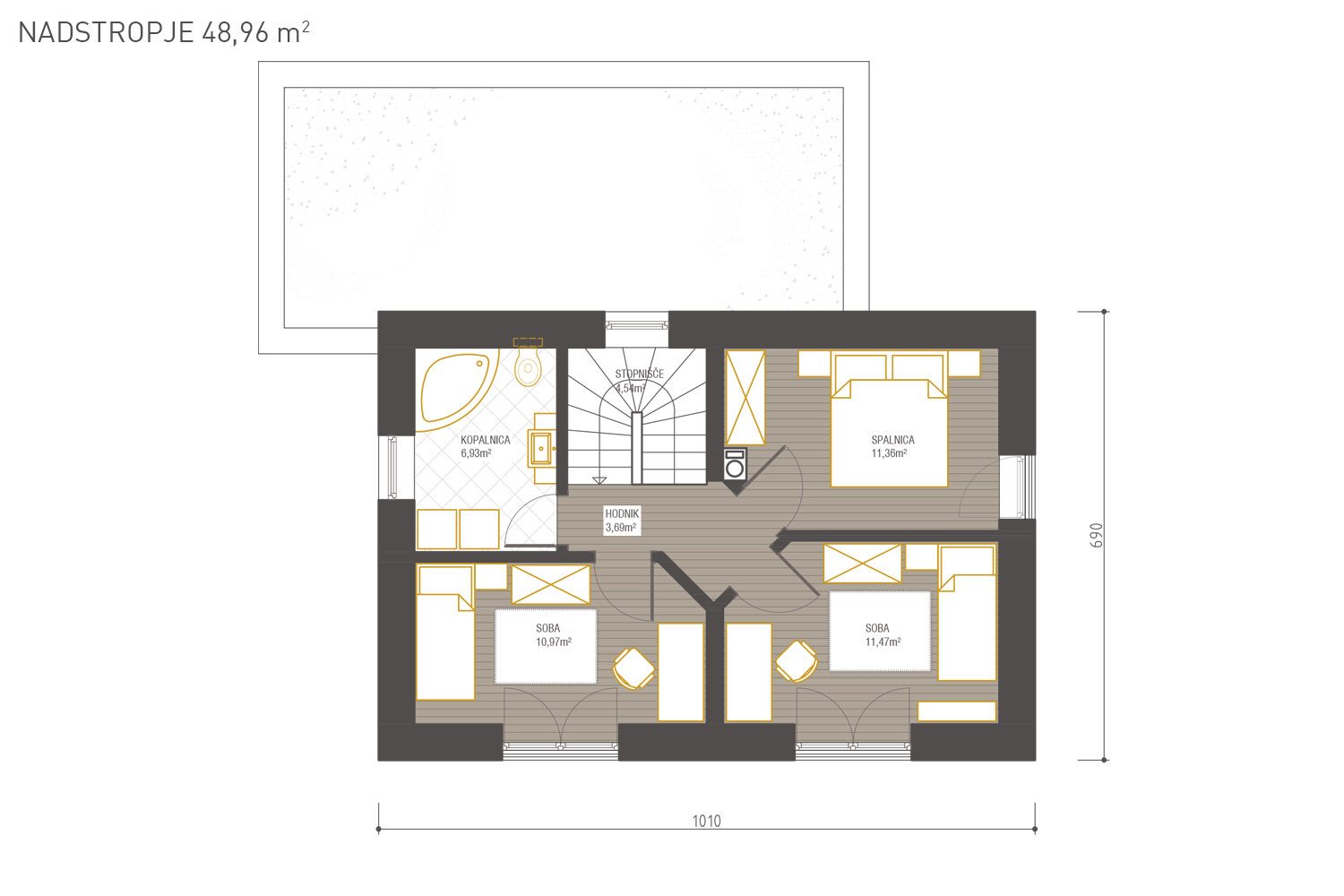 Izvedba medetažne armirano betonske plošče, v hišah, kjer je to predvideno s projektom PZI. Stopnišče in dimnik nista zajeta v paketni ponudbi, lahko je predmet dodatnega naročila na podlagi potrjene ponudbe s strani naročnika.