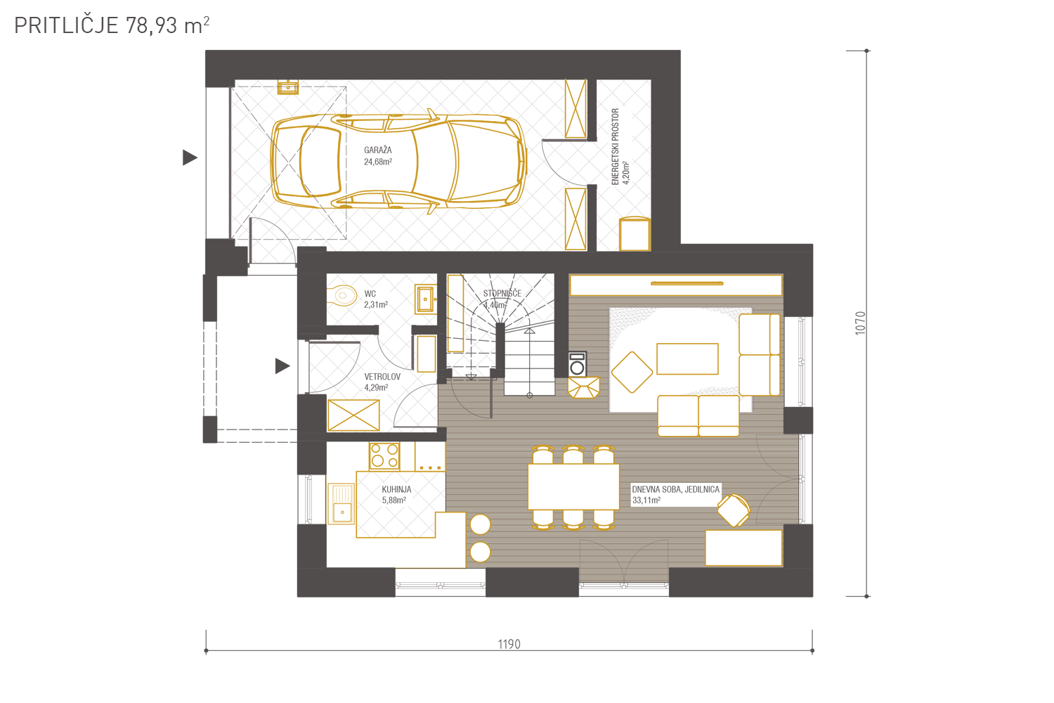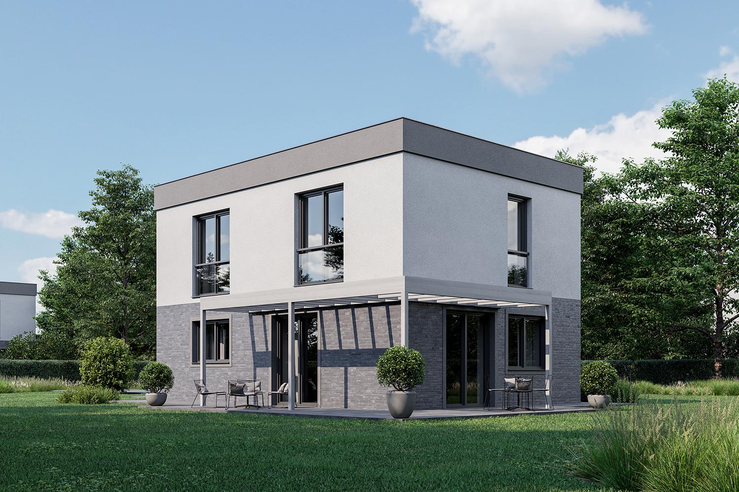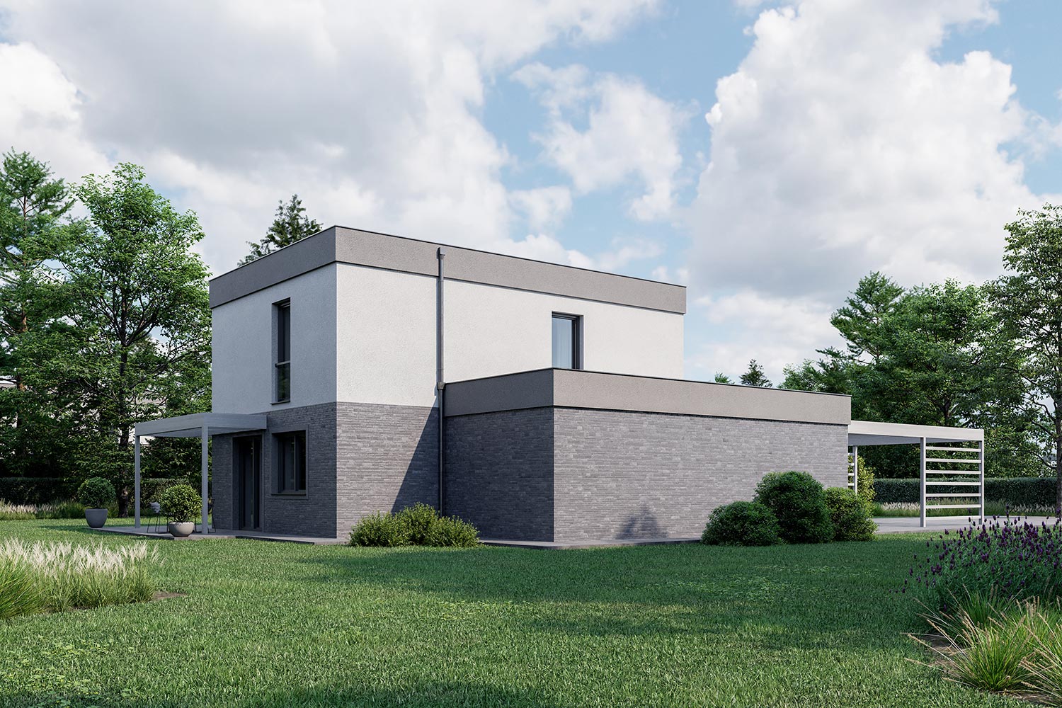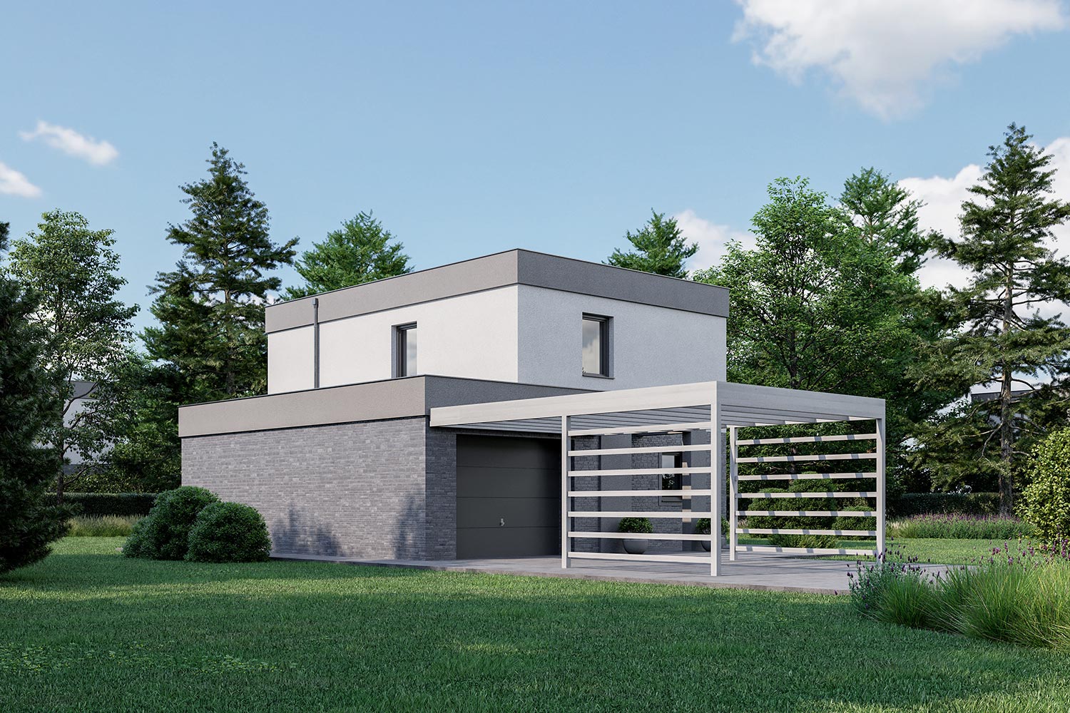 Ravno prav velika za štiričlansko družino. Z razgibano kombinacijo dveh kubusov je moderna rešitev za mestno okolje. Melena ima poleg bivalnih prostorov predviden tudi garažni prostor ter zunanjo pokrito teraso.