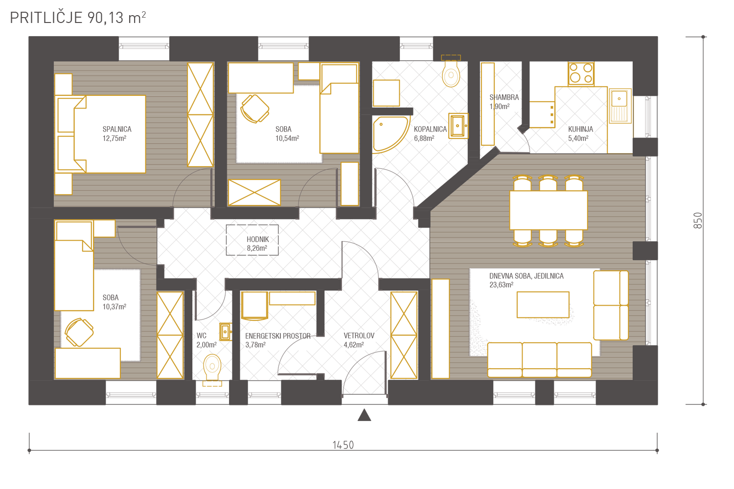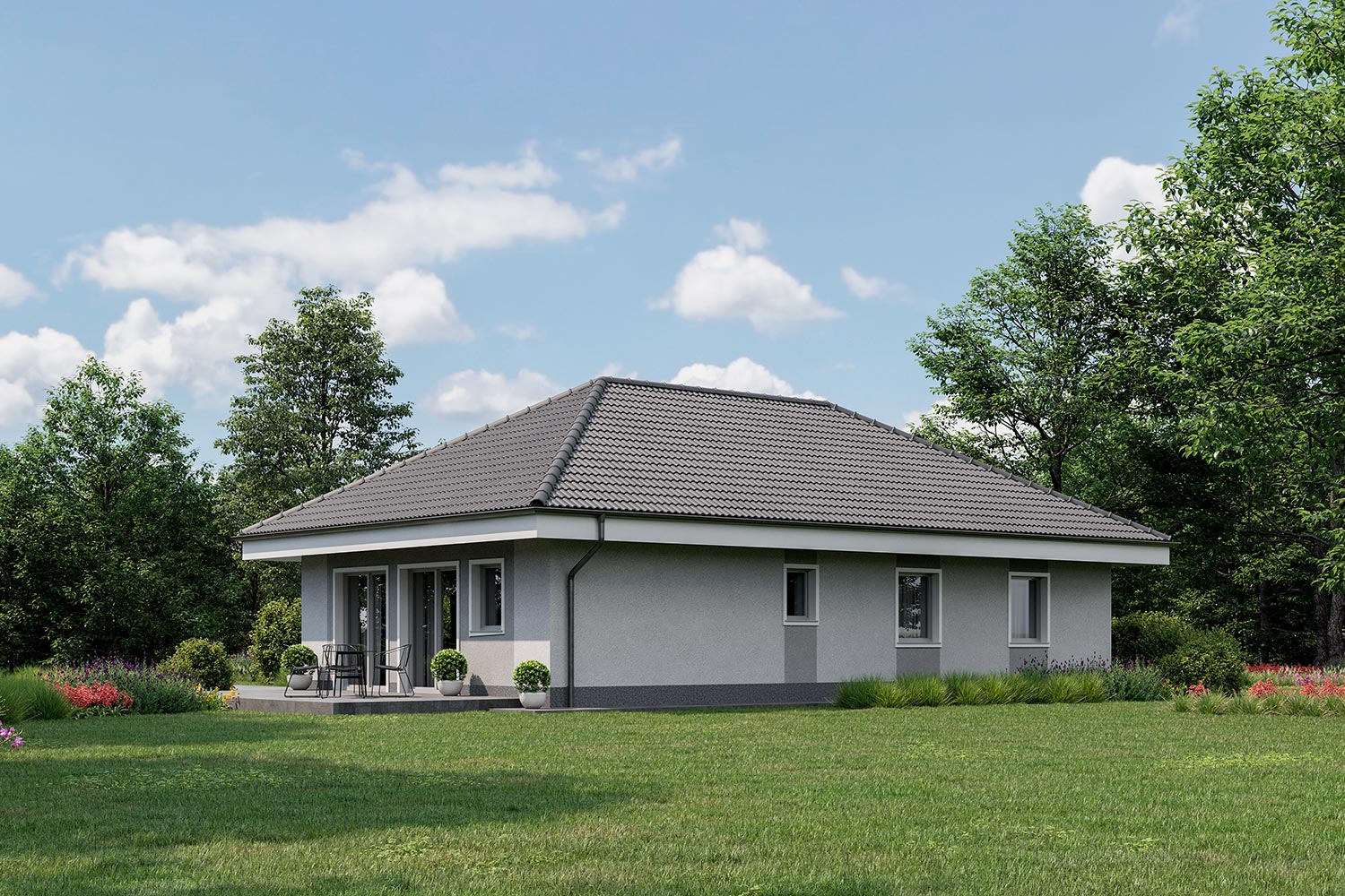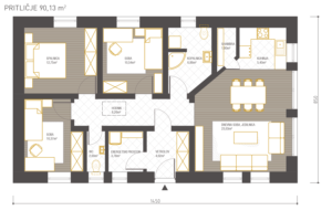 Majhna pritlična hiša s premišljeno razporeditvijo prostorov nudi 4-članski družini visoko bivalno ugodje. Metka je posebna zaradi 4-kapne strehe, pod katero je na voljo manjše podstrešje, vsi bivalni prostori pa so v eni etaži.