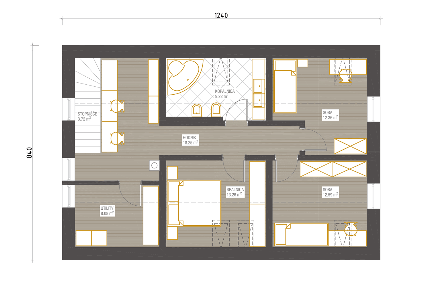 Nizkoenergijska hiša Sanja je primerna za skoraj vsa slovenska okolja. Z zanimivo razporeditvijo dnevnih prostorov, dodatno shrambo in kabinetom bo nudila dovolj prostora za druženje in ustvarjanje. V zgornjem nadstropju je polg štirih sob na voljo še razkošna kopalnica in galerija nad stopniščem.
