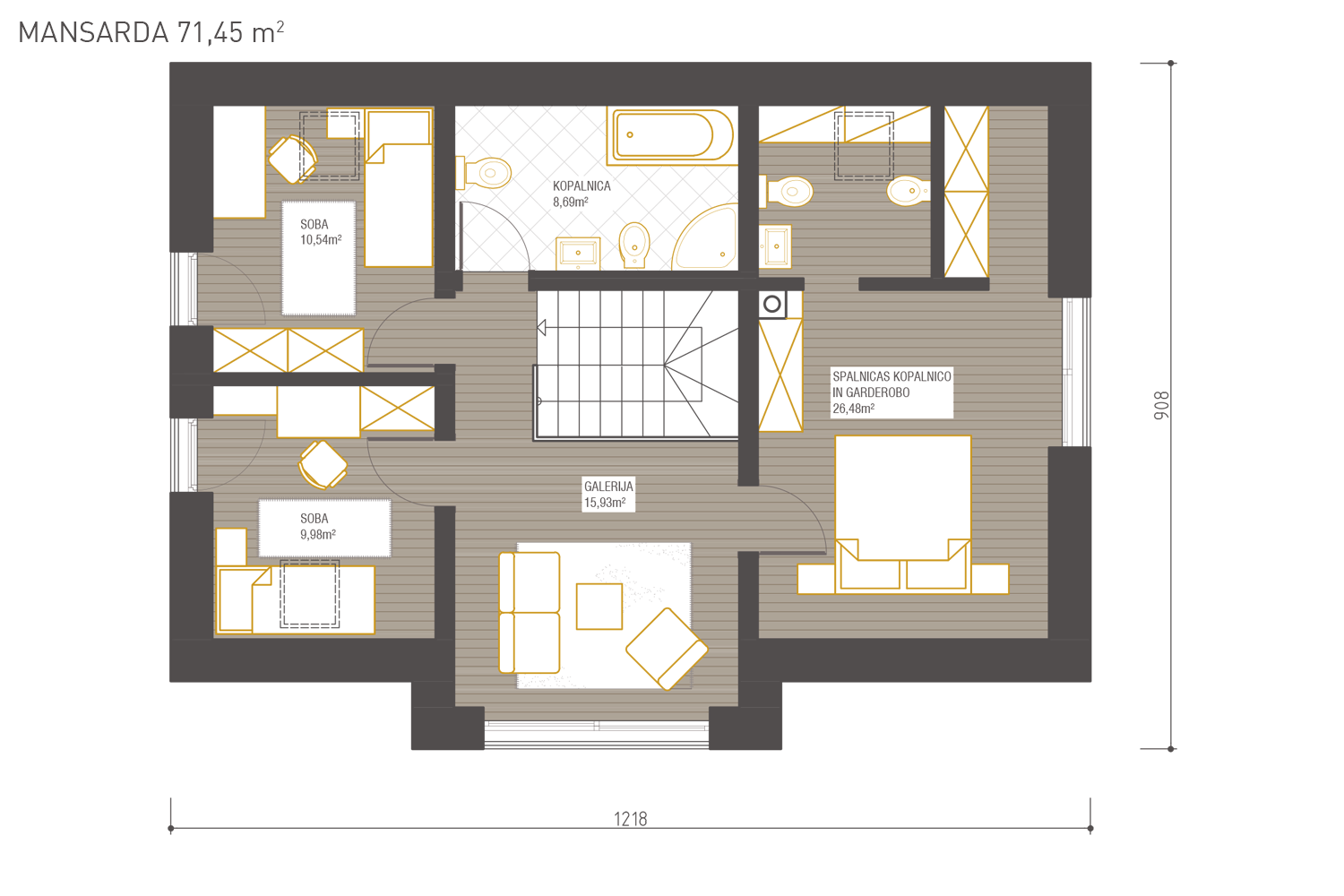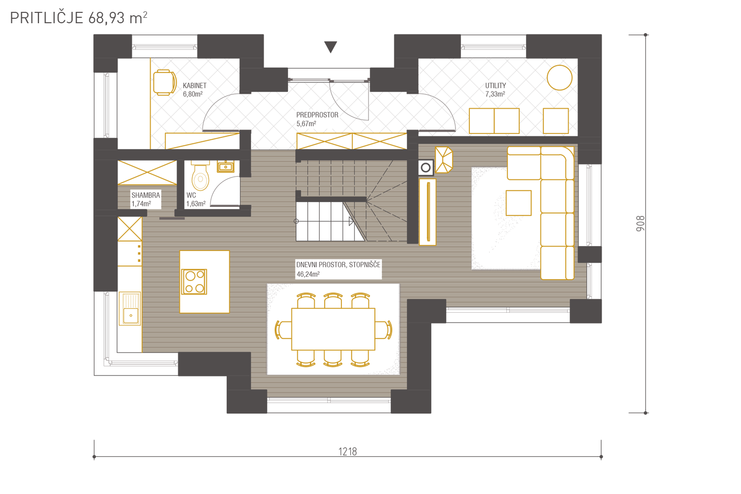 Zasnova hiše povzema tradicionalne oblike in razmerja, ki jih nadgrajuje z novimi elementi in koncepti. Odprt osrednji bivalni prostor v pritličju se preko galerije povezuje z mansardnimi prostori.