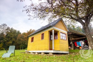 Takšno malo, leseno hiško sta si postavila Tjaša in Robi iz Brestanice, na parceli Robijevih staršev. Ima 17 m2 in jima nudi vse, ki ga potrebujeta. Trajnost je zanju zelo pomembna, saj se ukvarjata tudi s posebnim načinom vrtnarjenja ter predavanji (več).