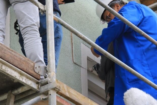 Gradbeni inšpektor je pregled pričel v prvi etaži, na vogalu okna. Izkazalo se je, da je fasadni sloj tudi po 20 letih suh, stabilen in normalno deluje.